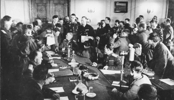 Druga wojna światowa zakończyła się podpisaniem przez Niemcy, które reprezentował feldmarszałek Wilhelm Keitel, bezwarunkowej kapitulacji w jednym z berlińskich kasyn o godz. 22.30 czasu środkowo-europejskiego dnia 8 maja 1945 r. Przerwanie działań wojennych nastąpiło dokładnie o godzinie 23.01. W Moskwie w momencie podpisywania dokumentu było już po północy, dlatego Rosjanie zakończenie wojny obchodzą 9 maja.