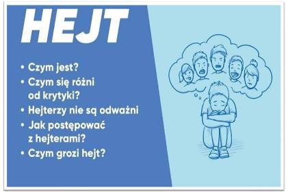 Hejt – to słowo, pojęcie bardzo popularne w Internecie i bardzo niebezpieczne. Jest to dość poważny problem społeczny, który dotyka zarówno dzieci, młodzież jak i dorosłych. Słyszymy o nim dość często, ale czy naprawdę wiemy czym jest i skąd się wzięło to zjawisko? Poniżej zamieszczamy slajdy, które przybliżą Wam czym jest hejt, co kieruje hejterami, jakie są konsekwencje stosowania tej formy przemocy i jak się zachować będąc adresatem hejtu. Wzrost świadomości i wiedzy na ten temat może być skutecznym narzędziem ograniczenia tego negatywnego zjawiska.