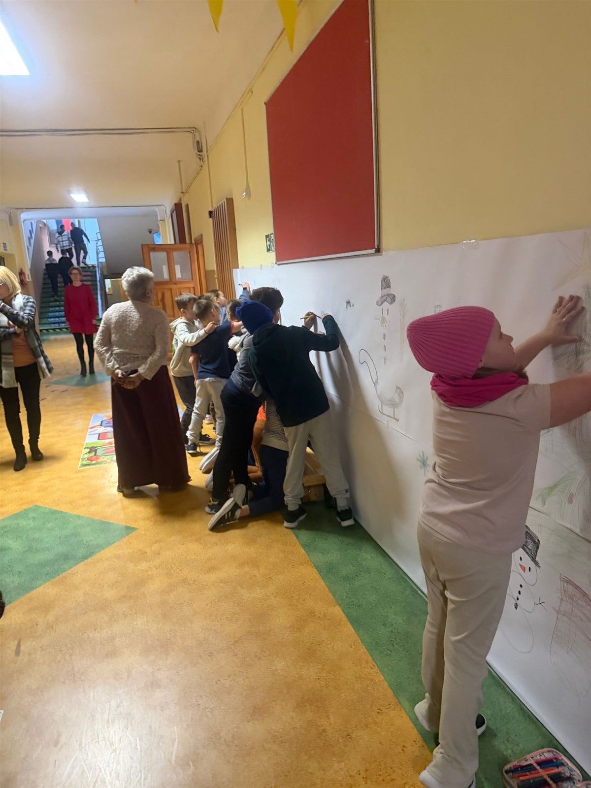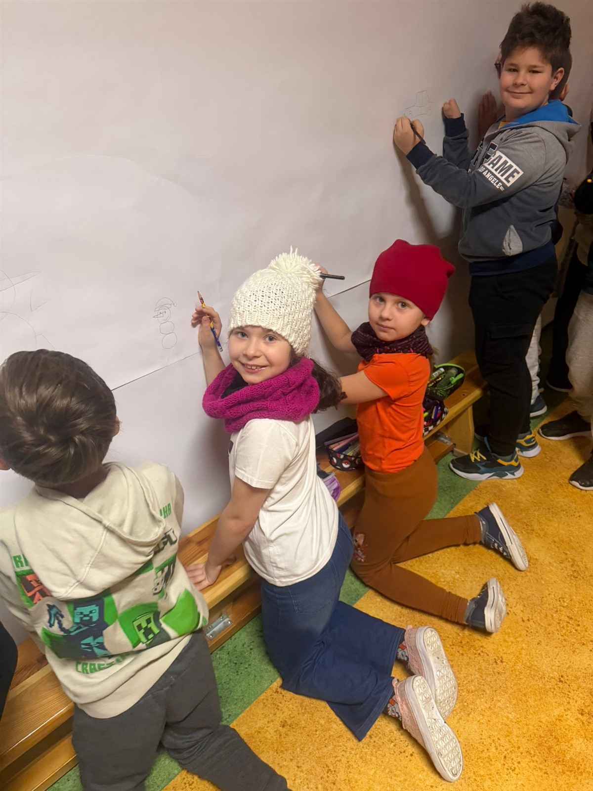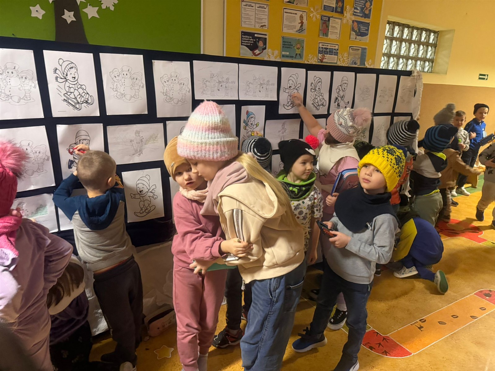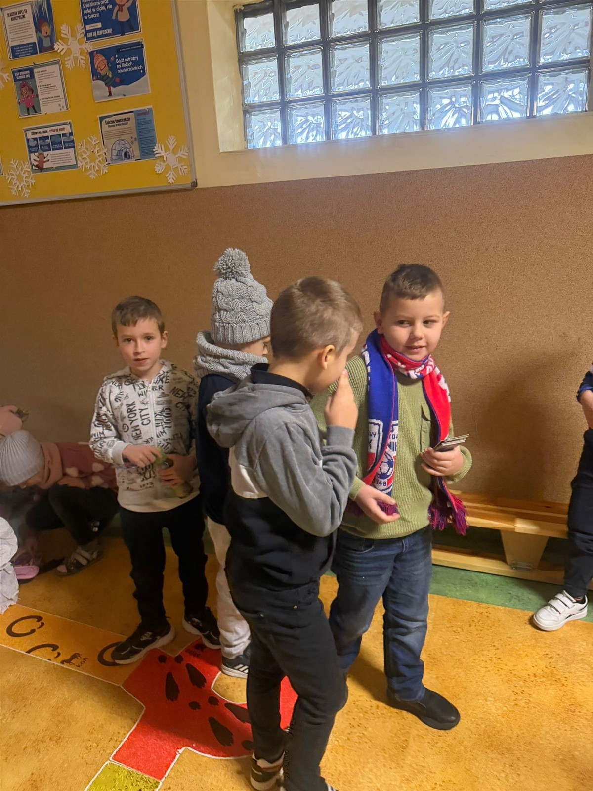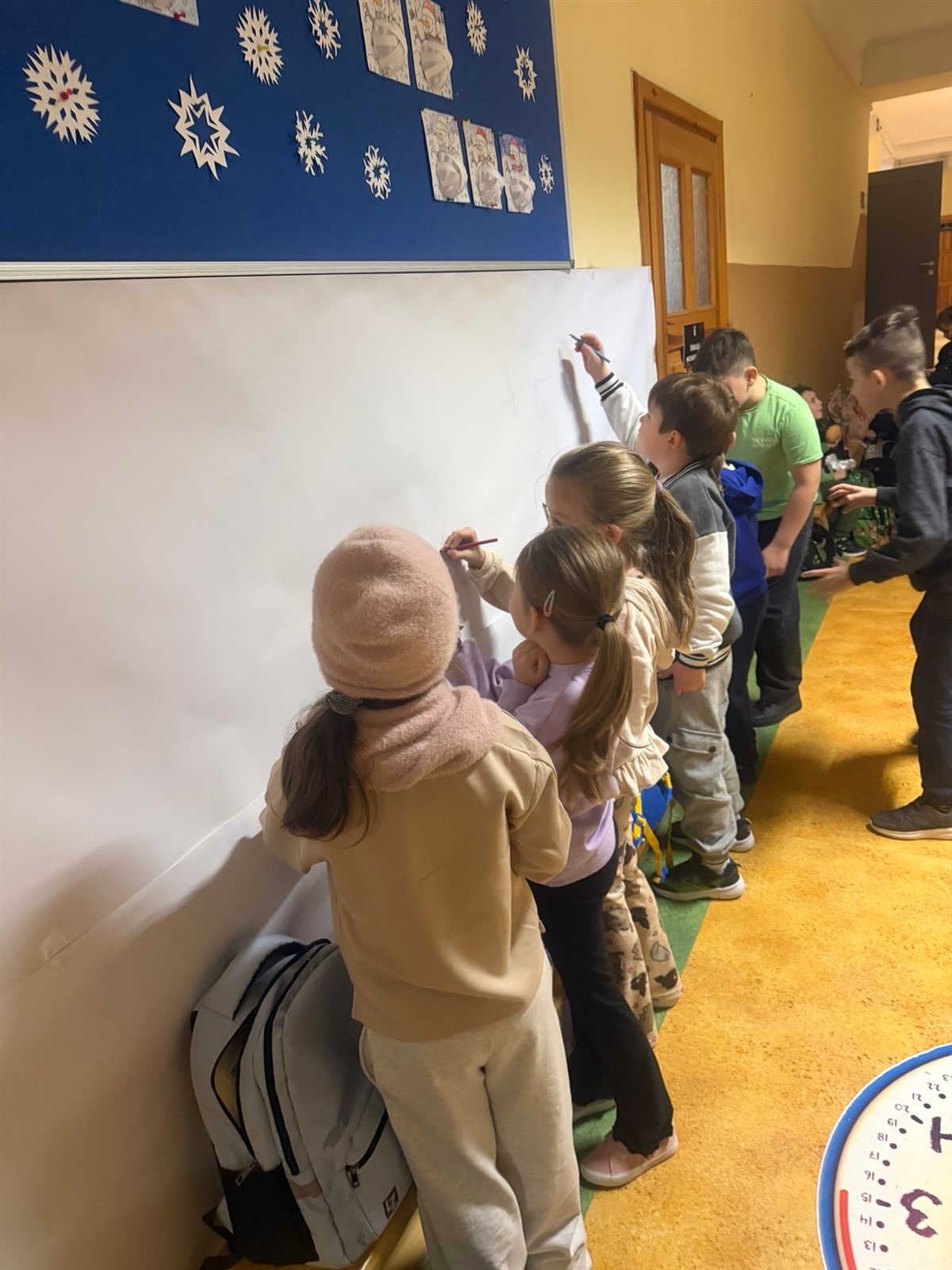 Uczniowie klas 0-3 brały udział w projekcie plastycznym BEZPIECZNE ZABAWY NA ŚNIEGU , tego dnia podczas przerw klasy młodsze mogły wykazać się inwencją plastyczną( na korytarzach były poustawiane stojaki z ogromnymi kartonami na których to, wspólnie stworzono projekt BEZPIECZNE ZABAWY NA ŚNIEGU pod okiem wychowawców i pań pedagogów naszej szkoły p. Ewy Grzelczak i p. Moniki Majchrowskiej oraz opiekunów Parlamentu Uczniowskiego naszej szkoły p. Uli Księskiej oraz p. Izabeli Andrzejczyk Wąsik. Uczniowie klas 4-8 ubrani w czapki, rękawiczki i szaliki brali udział w zabawie- KTO PRZEBRANY TEN NIEPYTANY.