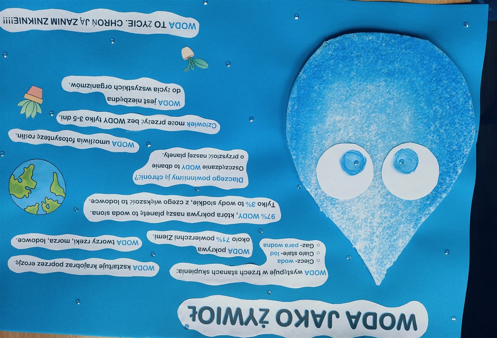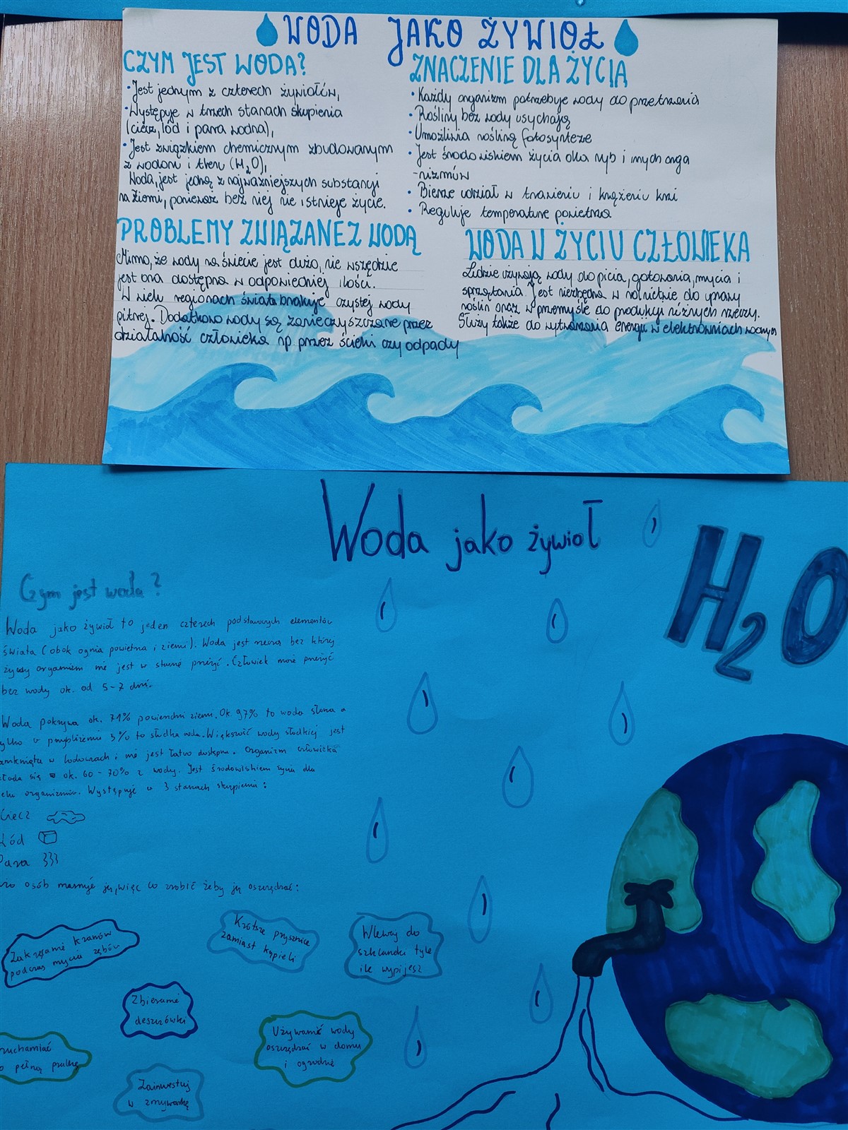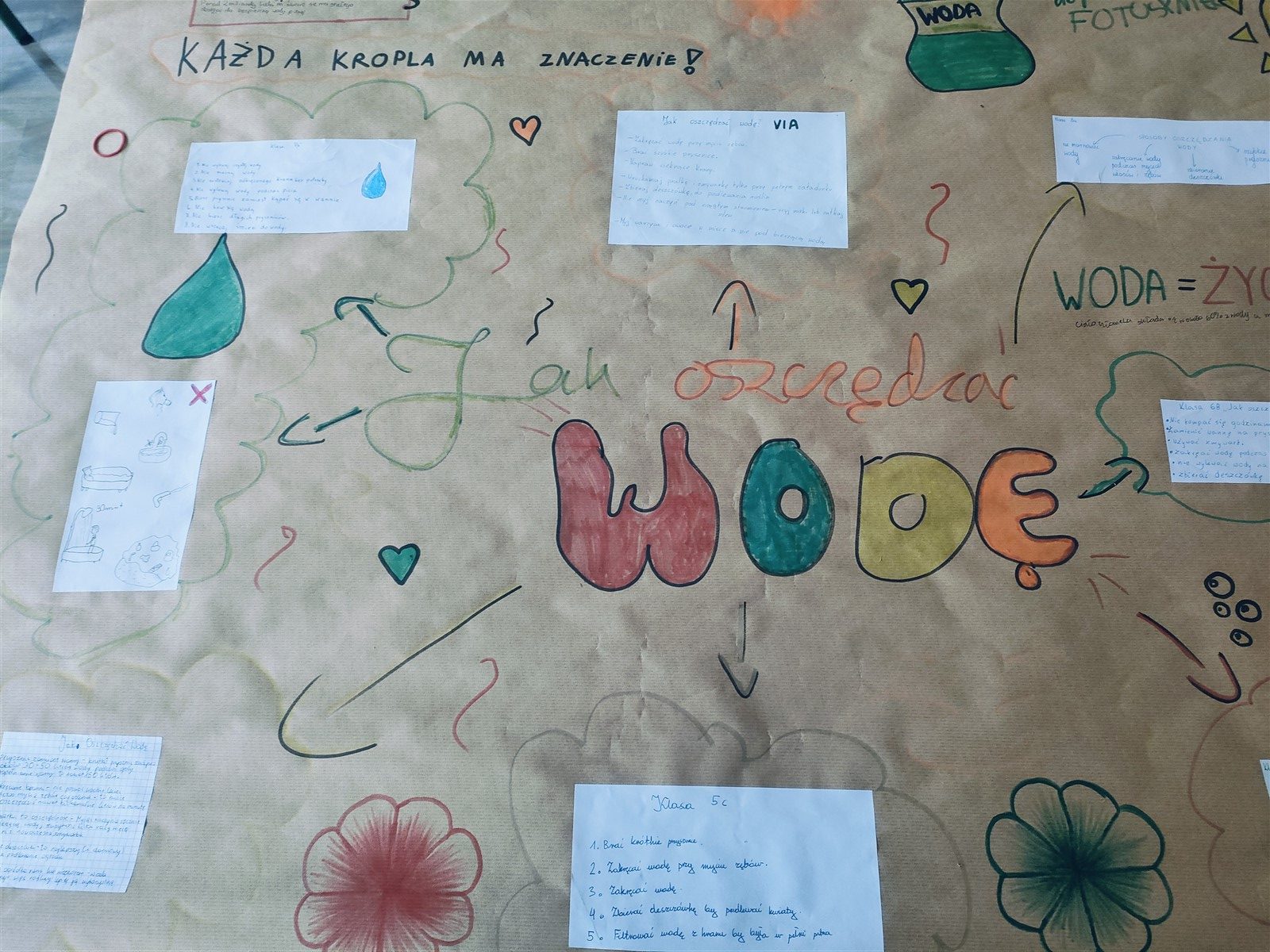 Uczniowie przygotowali również plakaty przedstawiające wodę jako jeden z żywiołów. Powstała także mapa mentalna z pomysłami na zmniejszenie zużycia wody – efekt wspólnej „giełdy pomysłów”.